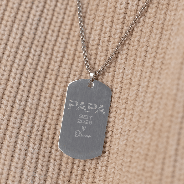 Überrasche deinen Vater oder Partner dieses Jahr mit einem Geschenk, das als bleibende Erinnerung von Jahr zu Jahr erhalten bleibt. Diese stilvolle Herren-Plattenkette ist aus langlebigem Edelstahl gefertigt und kann vollständig mit einer persönlichen Gravur versehen werden.
