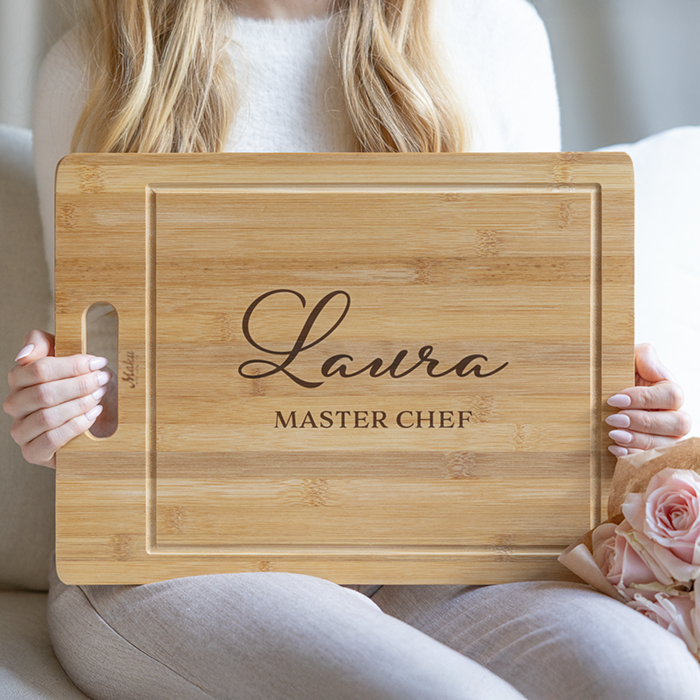 Ein großes Schneidebrett mit Gravur ist eine fantastische Geschenkidee für jede Hobbyköchin und jeden Hobbykoch! Ein Schneidebrett mit individuellem Text ist ein persönliches Element auf dem Tisch, das garantiert für Gesprächsstoff sorgt. Das elegante gravierte Bambus-Schneidebrett ist messerschonend und eine hervorragende Unterlage zum Kochen. Es eignet sich auch perfekt als Servierplatte für Käse, Aufschnitt oder Obst.
