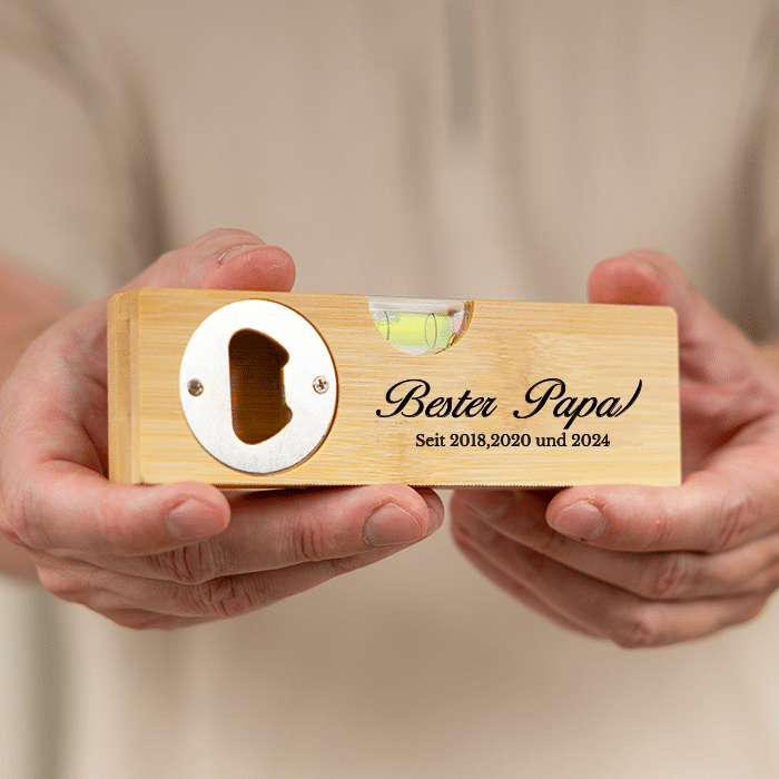 Ein Wasserwaagen- und Flaschenöffner aus Bambus ist eine lustige Geschenkidee für jeden Heimwerker. Gestalte den Text selbst und personalisiere das Produkt – zum Beispiel als tolles Geschenk zum Vatertag.