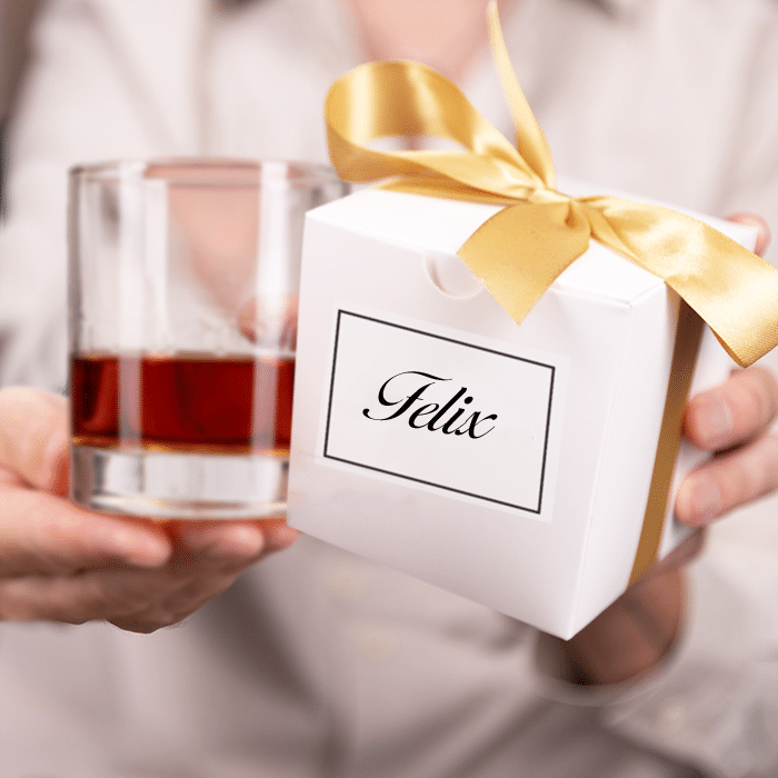 Wie wäre es, das personalisierte Whiskyglas gleich mit einer Flasche des Lieblingswhiskys des Beschenkten zu kombinieren? Das gravierte Glas wird in einer stilvollen schwarz-weißen Geschenkverpackung geliefert – einfacher kann Schenken nicht sein!