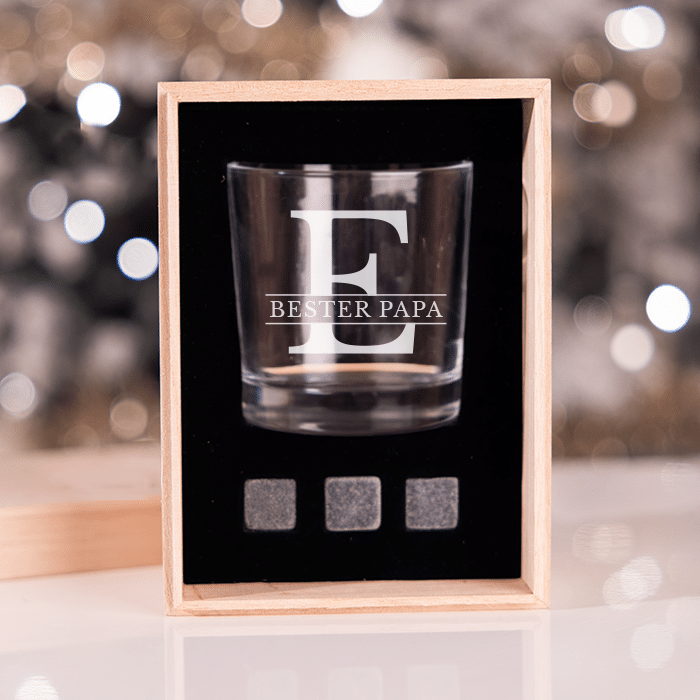 Das Geschenkset enthält ein personalisiertes Whiskyglas und drei wiederverwendbare Whisky-Steine, die das Getränk kühlen, ohne es zu verwässern – genau so, wie ein guter Whisky sein sollte.